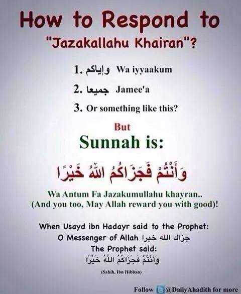Lalu ia mengatakan kepada pelakunya: The meaning of just the arabic word jazakallah is "may allah reward you", this itself is incomplete, as you can say may god reward you with bad or evil. Jazakallah khairan = semoga allah . Jazakumullah khairan kathira (untuk ramai).